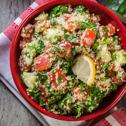 Cook the couscous according to package directions. Fluff with fork. Meanwhile, dice roasted red peppers and add diced tomato and cucumber to a bowl. Add lemon juice and olive oil and stir to combine. Finely chop mint (or parsley) and add to bowl, along with the cooked couscous, and toss to combine. Season with salt and pepper to taste. Enjoy!